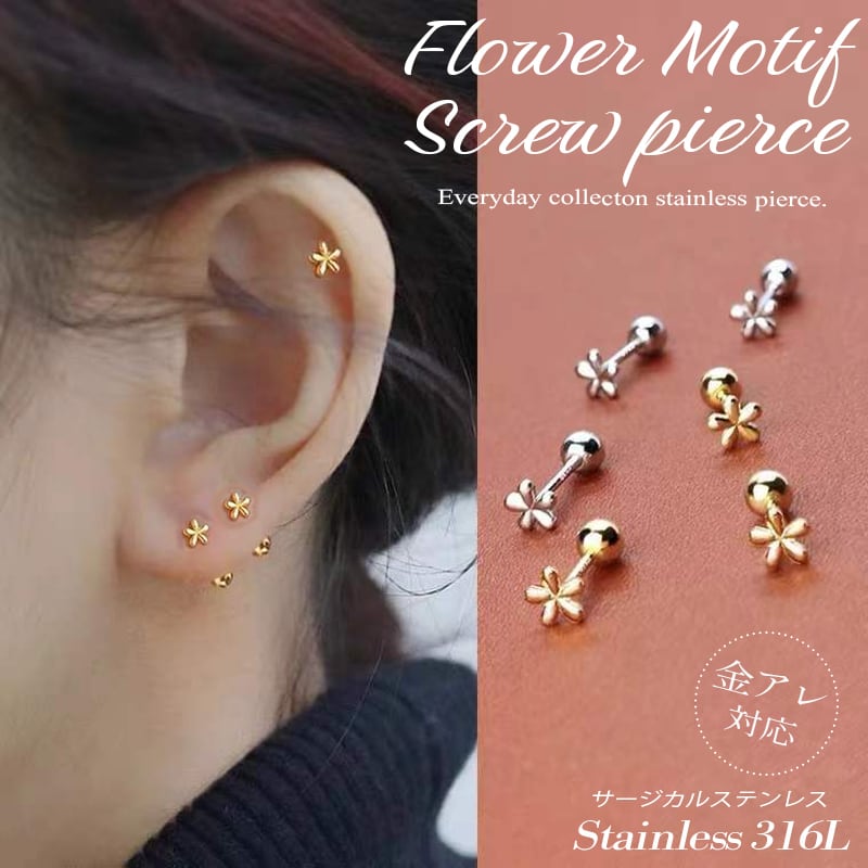 サージカルステンレス ピアス つけっぱなし 316l 花 フラワー ネジ式 ねじ式 チタン 付けっぱなし 金属アレルギー 極小 小さい 小ぶり 小さめ【両耳用・2個売り】